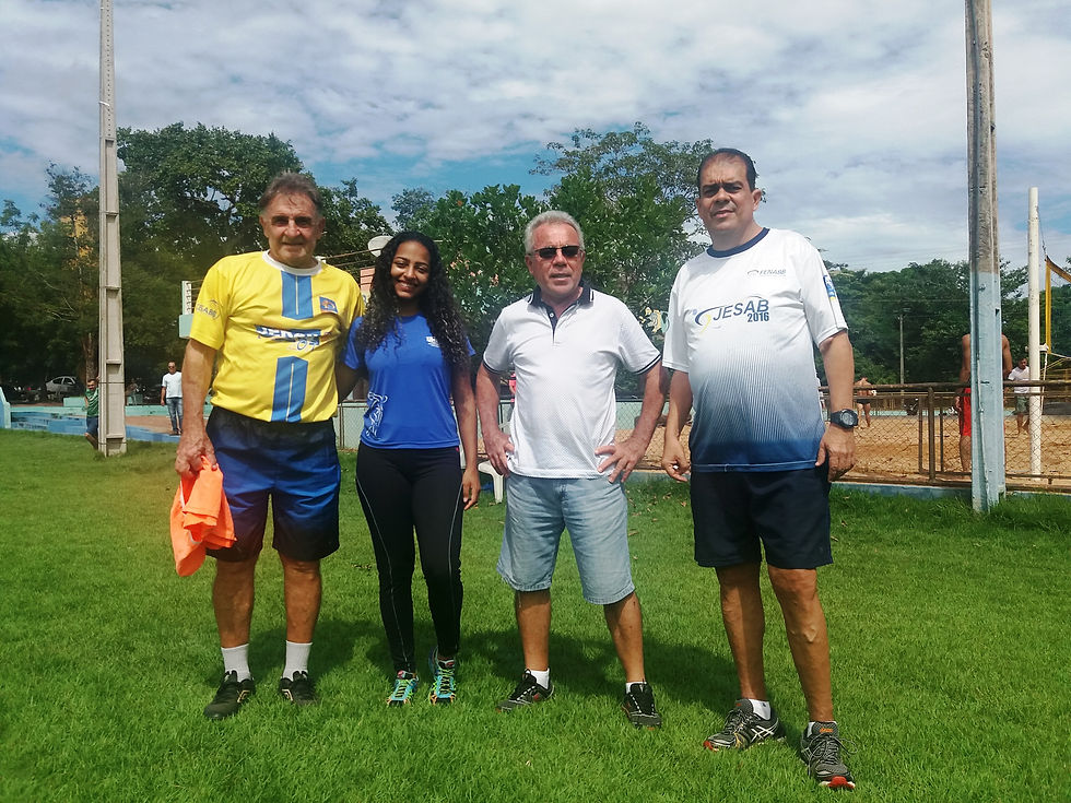 A garota que aparece nesta foto, ao lado do Professor Sergio Basso, do Coordenador de Esportes José Ziza Estevam, e do Auxiliar Victor Morbeck, é a Jéssica França, estagiária de Educação Física da AABB Cuiabá. Na manhã de hoje ela estreou como bandeirinha no jogo-treino da AABB CUIABÁ contra o Círculo Militar. Jéssica admite que entende pouco das regras do futebol, e neste sentido teve alguma dificuldade para levantar a bandeira e apontar os lances de impedimento. No entanto, a garota, que é acadêmica da Univag, diz que tem interesse em fazer parte de uma equipe feminina de futebol, caso a Escolinha da AABB Cuiabá consiga realizar este objetivo. Ela também se comprometeu em falar com as amigas da Faculdade para ver a possibilidade de ajudarem na formação da equipe.