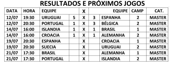A equipe da Alemanha, categoria absoluta, ganhou mais uma partida na última rodada e vai se confirmando na liderança do campeonato da AABB, somando 18 pontos. O segundo colocado é o Uruguai, onde joga o artilheiro do campeonato até aqui, o Yuri, com 8 gols. Na categoria master a Bélgica continua disparada na liderança, e na categoria supermaster o topo da classificação tem os times de Portugal e Brasil, com 13 pontos ganhos. Mas ainda tem muito jogo pela frente daqui até o final de agosto, quando encerra o campeonato.