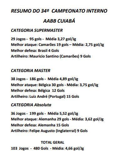 Em 103 jogos pelo 34º Campeonato Interno da AABB Cuiabá, foram feitos 480 gols! Média de 4,66 gols por jogo ... Conheça os times com o melhor ataque, a melhor defesa e os artilheiros.