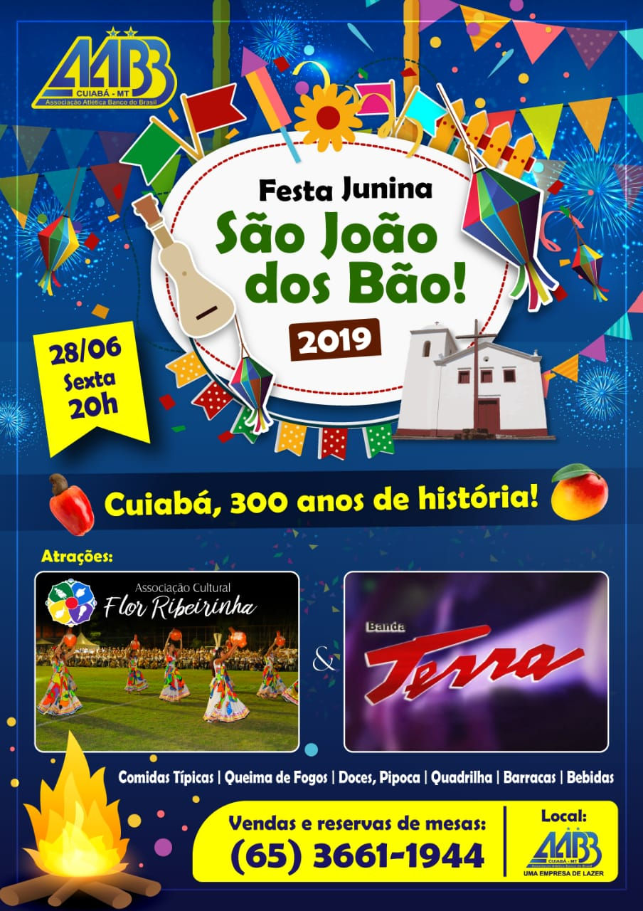 A AABB Cuiabá orienta os festeiros a anteciparem a compra das fichas de comida e bebida. Isso facilitará a sua vida na hora do atendimento. A propósito, você já garantiu o seu ingresso? Isso também é muito importante, porque a festa junina da AABB costuma lotar, e quem deixar pra comprar na última hora pode ser surpreendido. O preço da mesa para sócio é R$ 95,00 e individual paga R$ 25,00. Para não sócios, o preço da mesa é de R$ 130,00 e R$ 35,00 o valor do ingresso individual. E você já sabe que este ano teremos a animação da Banda Terra? Também vai ter outra grande atração, o Flor Ribeirinha. Imperdível! Então fica ligado aí. A festa junina São João dos Bão será no dia 28 de junho, sexta-feira, às 20 horas. Vai ter comidas típicas, queima de fogos, doces, pipoca, quadrilha, barracas, bebidas e muita diversão!
