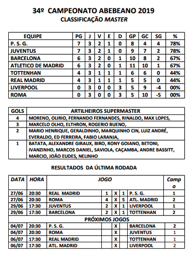 Edílson (jogador do Nápoli) e Max (do Liverpool) da categoria supermaster fizeram 3 gols cada um e poderiam pedir música. A Juventus do Estrela e Volpato tropeçou diante do Nápoli, perdeu a invencibilidade e foi goleada por 4 x 0. Além dos 3 gols do Edílson, o Peixe também balançou as redes dos juventinos. No outro jogo da categoria, o time do Max ganhou do Manchester City por 3 x 2. Pela categoria master, a Juventus ganhou de 2 x 1 do Liverpool, e agora é líder do campeonato. No outro jogo da categoria, o Barcelona do Marcelo, Luizinho e companhia derrotou o excelente Tottenhan, do Marcelo Olho e Walter Betoni. Foi um jogo equilibrado e bastante disputado. Outro jogo bastante disputado e muito equilibrado foi pela categoria absoluta, entre Ajax e Barcelona. Com um goleiro improvisado e sem o Ricardo Lopez, o Barcelona desta vez perdeu, por 3 x 2, mas foi um jogão de bola, com jogadas rápidas e muita vontade de vencer de ambos os lados. No outro jogo da absoluta, a Juventus goleou o Atlético de Madrid. A goleada começou com 2 belíssimos gols logo no começo da partida, e com a expulsão de 2 jogadores do Atlético ficou ainda mais fácil para os juventinos. Resultado final 6 x 2.